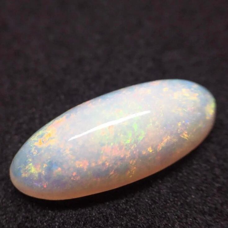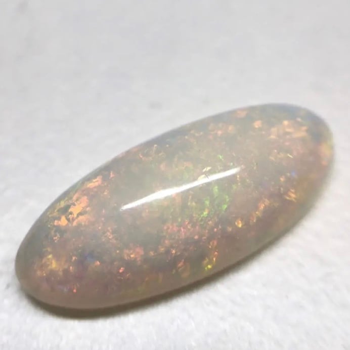 乳白色の中から優しい虹色を覗かせる遊色効果がホワイトオパールの魅力です。ブラックオパール等の強烈さとは対象的で、柔らかな優しい色合いは、日本人の肌に映え、公式の場や、和装などにも幅広い場での装いにマッチします。大粒なので、帯留めにしたら、素敵だと思います!